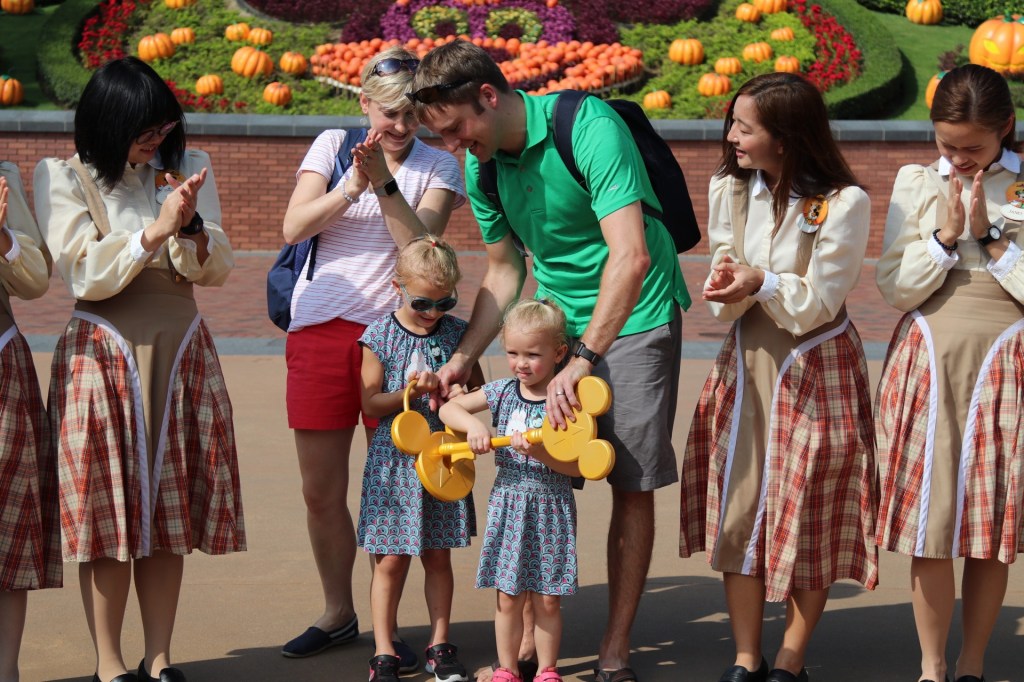 Since we got to the park early, we had to wait in a short line for it to open. While we were waiting, some of the staff came over to ask if we would like to be the family that opens the gates to Hong Kong Disneyland for the day. Um, sure! They ushered us to a special waiting area, and then we got to go inside the gates and wait for Mickey and Minnie to arrive for their morning meet-and-greet. We took zillions of pictures with them and then it was time for N and W to turn the magic key and open the park! This was a pretty amazing experience for the girls, and it made them feel sooo special. It was a great start to a wonderful day!