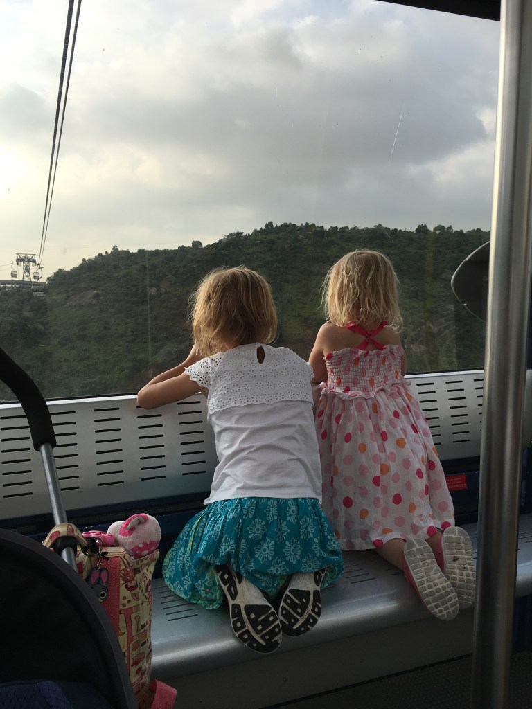 We decided that since this was our last day in Asia, we should make our way over to see the “Big Buddha.” The Big Buddha is the largest Buddha statue in Asia, and in addition to being a sight worth seeing in and of itself, it can only be accessed by a gondola. But not just any gondola. This gondola takes about 20 minutes and makes three 90-degree turns up and over the bay and into the hills. We dropped our carry-on bag at the luggage drop at the bottom of the gondola and hopped right on. We all really enjoyed the view and had fun watching hikers trek up the mountain path toward the Big Buddha. We vowed to come back when the girls were older so that we could make the hike, too.
