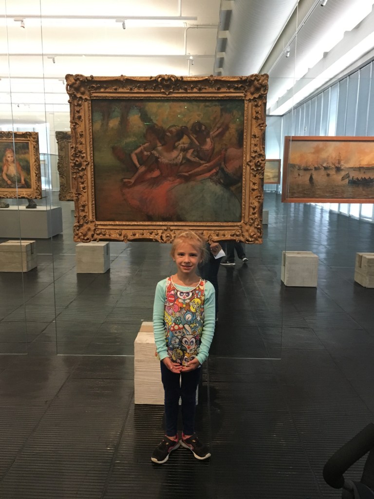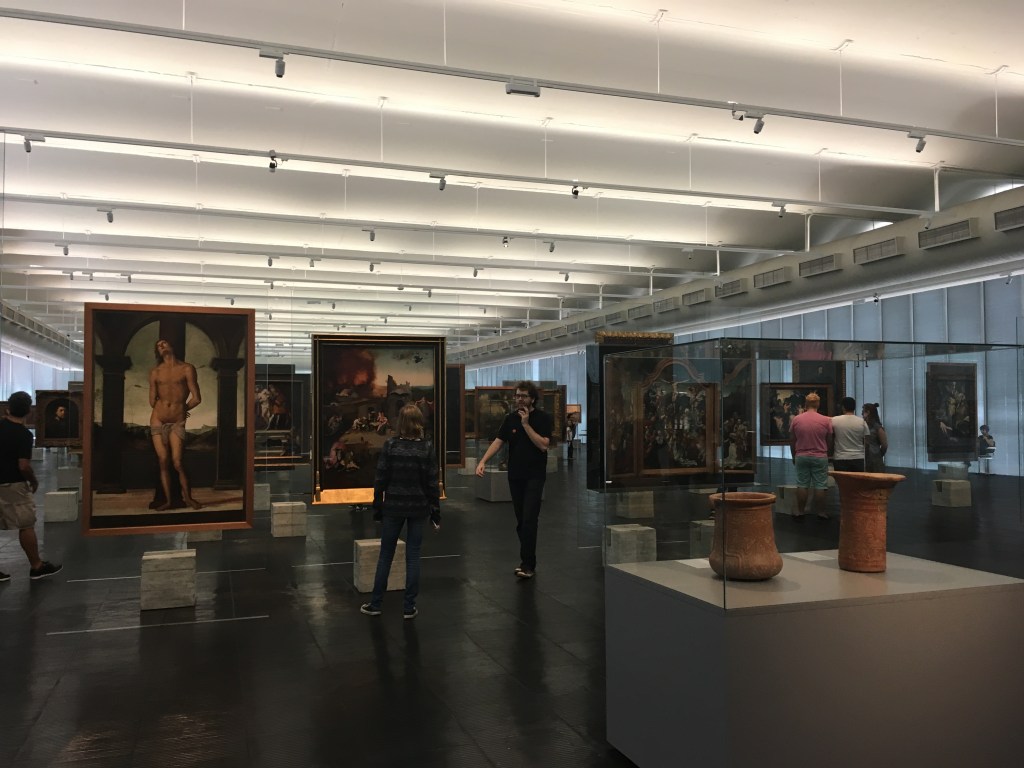 Once our bellies were full, we wound our way through the museum. The MASP collection, which includes Brazilian, Latin American, and European masterpieces, is limited by its space, but the curators make the most of the area they do have by taking the art off of the walls and into contact with the visitors. The pieces are displayed on glass stands that form aisles in a big open room. There are no velvet ropes to separate the viewer from the Van Gogh. In that sense, it’s all very democratic. The art comes to the people; not vice versa. Art, after all, is politics.
