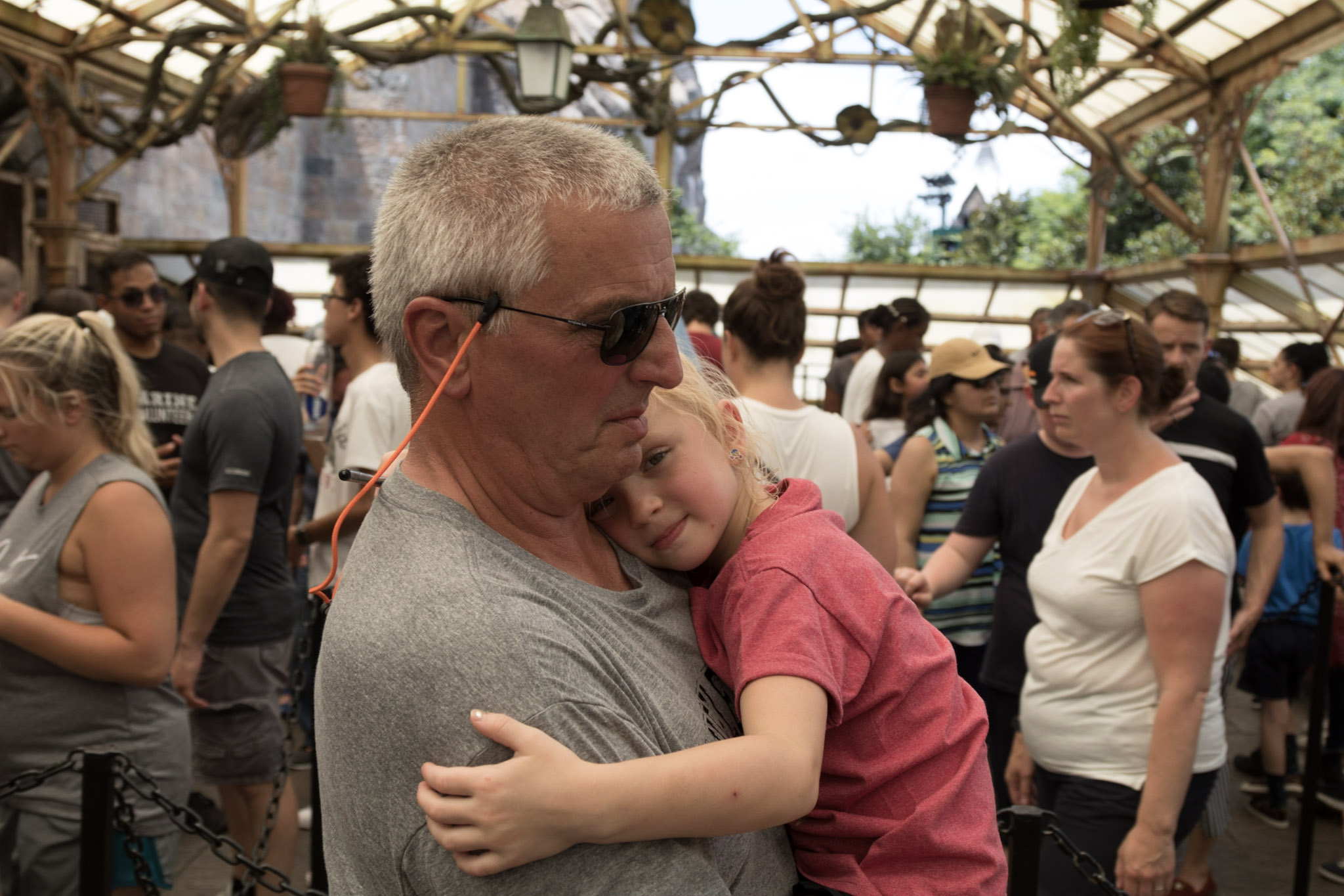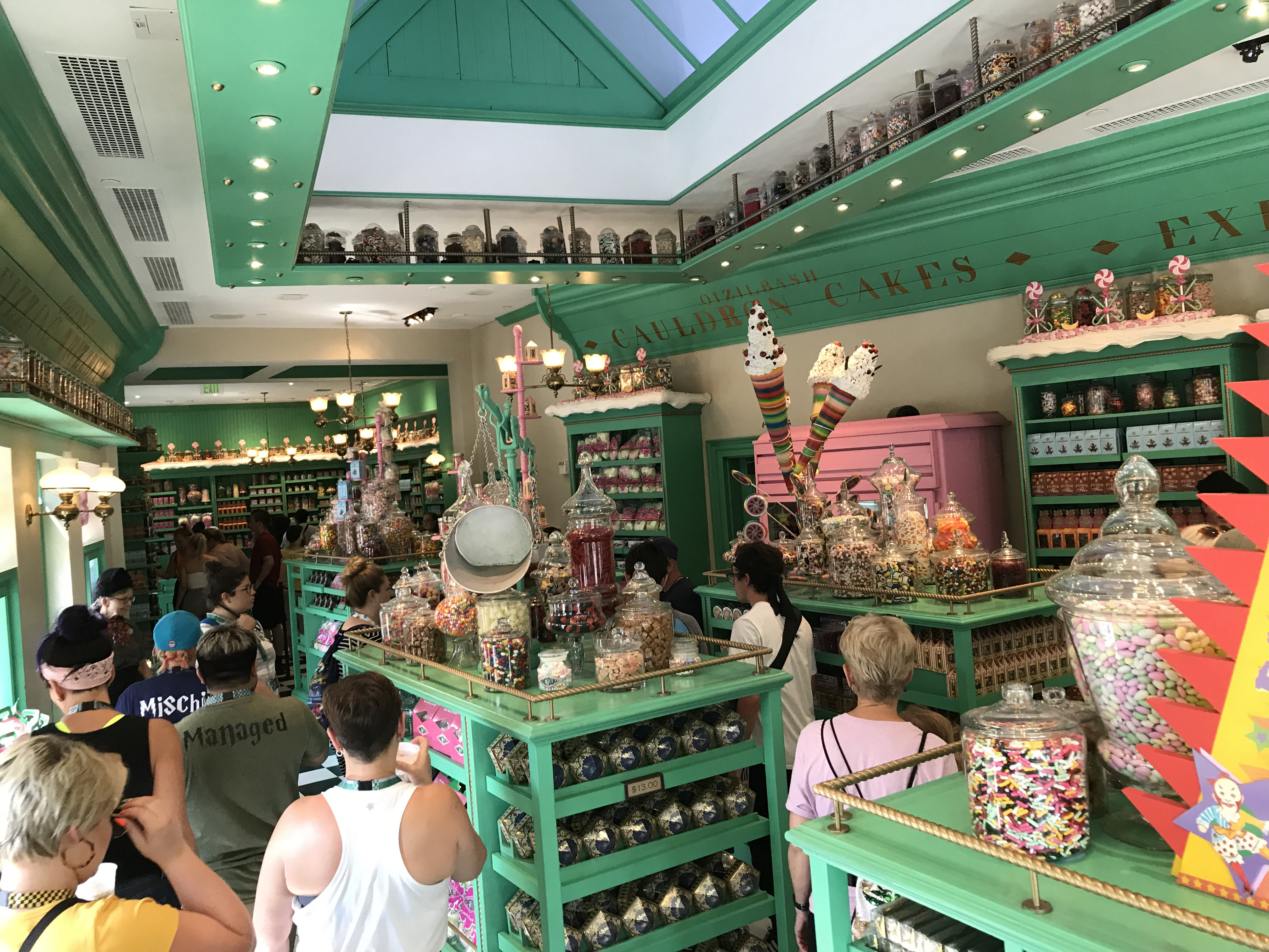Over in Hogsmeade, we had lunch at the Three Broomsticks and rode both the Flight of the Hippogriff (the girls’ favorite) and Harry Potter and the Forbidden Journey. W wasn’t quite tall enough for the latter, but the queue wound its way through Hogswarts, and we all enjoyed seeing various Hogwarts rooms and characters come to life. We closed out our afternoon in Hogsmeade with a trip to Honeydukes.
