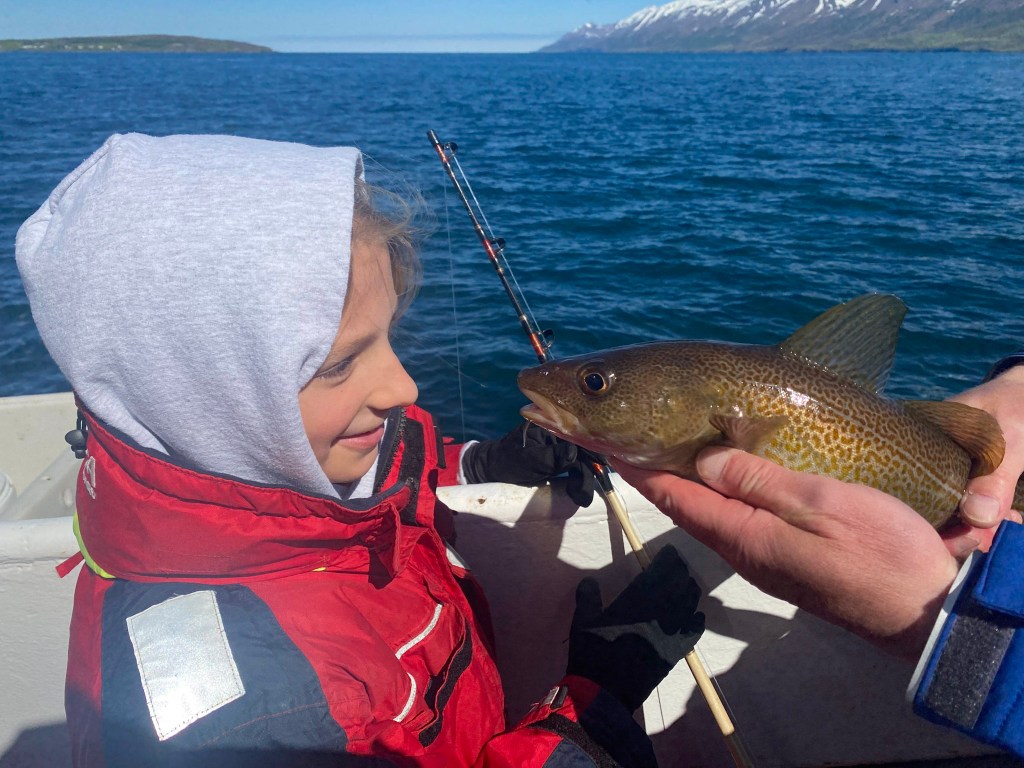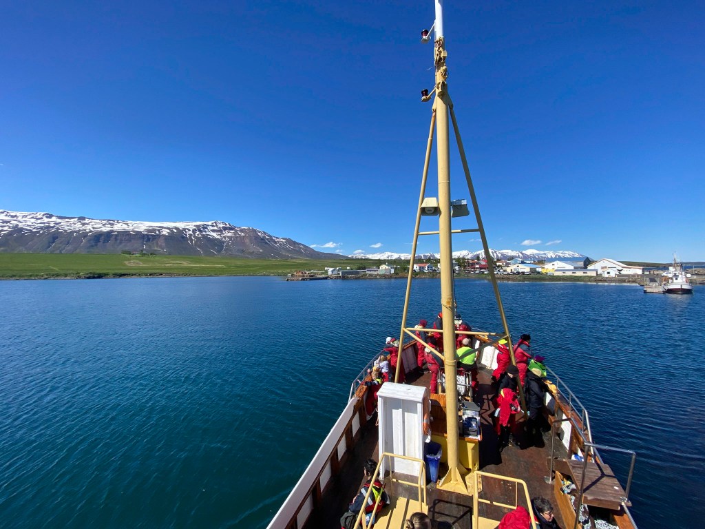 The main item on our agenda in Akuyreri was whale watching. We had a mid-morning sailing with Whale Watching Hauganes, Iceland’s oldest whale watching tour company, located 25 miles up the fjord from Akuyreri. The sun was shining; our waterproof, warm, and flotation-device outfits were on-point; and our guides were again friendly and knowledgeable. We got to see a humpback whale and a pair of porpoises while enjoying the beauty of the fjord. We appreciated how conscientious the captain was of not crowding the whales. When too many boats came to the area, we moved along. We also had the chance to do some catch-and-release fishing. N caught a fish almost right away and the captain offered her the chance to give it a kiss before he threw it back into the sea. Not too surprisingly, she passed on the kiss but enjoyed the opportunity nonetheless!